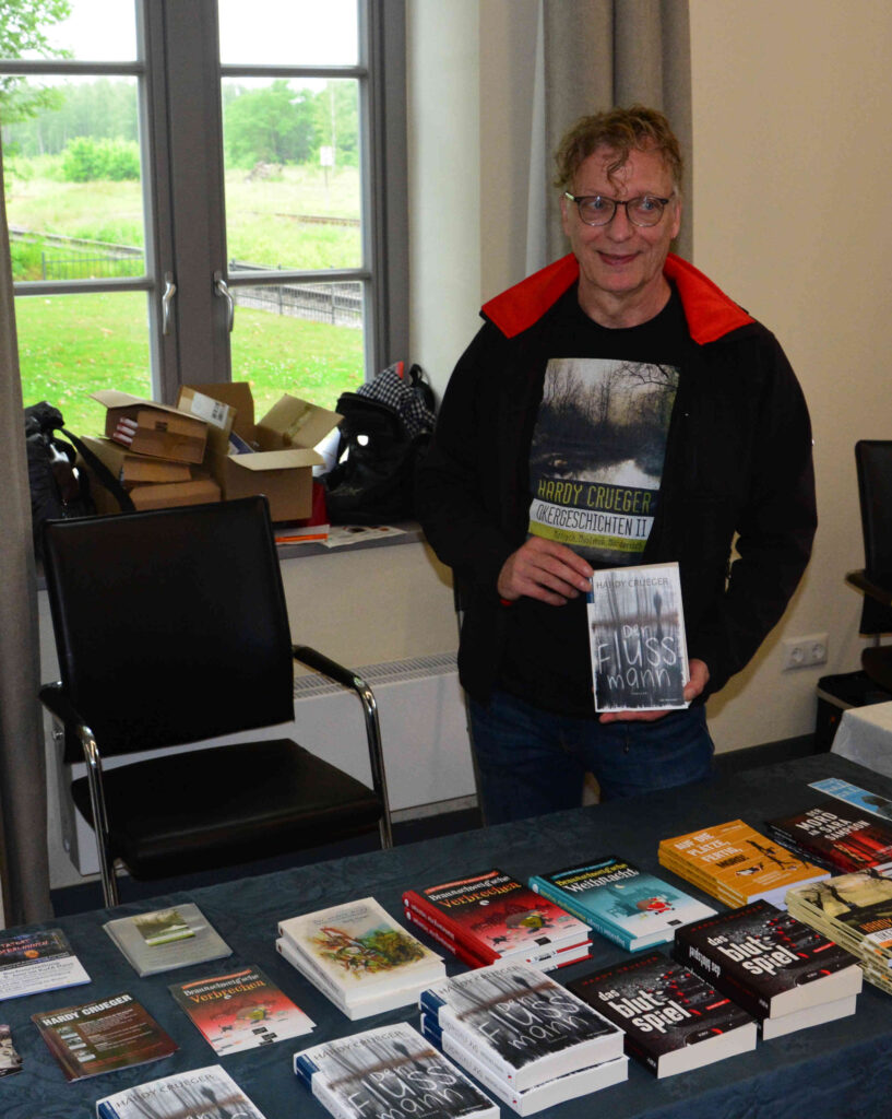 Seine Bücher interessierten mich, weil mich Hardy als Mensch interessierte, und so begann ich mit den „Okergeschichten“, mich in sein Werk hineinzulesen. Ich glaube, die „Okergeschichten“ waren sogar ein Tipp von Hardy selbst, als ich ihn fragte, womit ich anfangen könnte. „Das Schlachthaus“ wollte er mir auf einer Lesung nicht verkaufen, wie er mit den Worten „Das verkaufe ich Dir nicht! Das ist zu hart für Dich!“ und einem schelmischen Grinsen unterstrich. Ich habe es natürlich dennoch gelesen. Und gefeiert. Obwohl ich nach der Lektüre Matthias’ Äußerung „Manchmal habe ich Angst, mit Hardy einen Kaffee trinken zu gehen. Weil er derjenige ist, der sich all diese Geschichten ausgedacht hat.“ gut nachvollziehen konnte. Aber zurück zu den „Okergeschichten“: In zwei Bänden erzählt Hardy dort von der Oker, jeweils 12 Geschichten pro Band, und dazwischen ist „Der Untergang. Die dreizehnte Okergeschichte“ erschienen. Mein absolutes Lieblingsbuch aller Zeiten, gegen das nicht mal „Früchte des Zorns“ oder „Der Zauberberg“ gegenanstinken können: Ein nur ca. 50seitiger Action-Katastrophenthriller, in dessen Verlauf das Ausflugsschiff „MS Aquamarin“ durch die explosionsbedingt geborstene Staumauer auf einer riesenhaften Flutwelle bis weit in den Landkreis Gifhorn hinein katapultiert wird. Inmitten dieses Pandämoniums findet Crueger noch Zeit, zwei am Ufer der Talsperre angelnde Freunde als griechischen Chor zu installieren und haufenweise Innenansichten der handelnden Figuren auszubreiten. Dieses Buch enthält mein Lieblingsliteraturzitat aller Zeiten: Das Schiff reißt sich los und wird von der Strömung des berstenden Okerstausees hinweggerissen und der Kapitän – Tiefensee mit Namen – ist machtlos. Und dann schreibt Hardy: „Kapitän Tiefensee stand hoch aufgerichtet im Heck, ballte die Fäuste gen Himmel und verfluchte Gott.“ Besser hätte es niemand auf den Punkt bringen können. Ich fragte Hardy, warum der Kapitän denn ausgerechnet Tiefensee hieß, wie der ehemalige Verkehrsminister, und bekam die typische Hardy-Crueger-Antwort: „Wie wer? Der Kapitän fährt auf einem See, der See ist tief! Wie sonst hätte ich ihn nennen sollen?“ Fall abgehakt. Dieses Buch, wie gesagt, nur knapp 50 Seiten lang, hat mir verdeutlicht, wie ressourcenschonende Belletristik funktioniert. Jeder andere Thrillerschreibende hätte für diese Geschichte 700, wenn nicht mehr Seiten vollgekritzelt und damit den halben Harz abgeholzt. Nicht so dagegen Hardy: Auch in seinen anderen Thrillern habe ich gestaunt, wie viele Informationen, Charakterstudien und zitierfähige Formulierungen auf erstaunlich wenigen Seiten Platz finden.